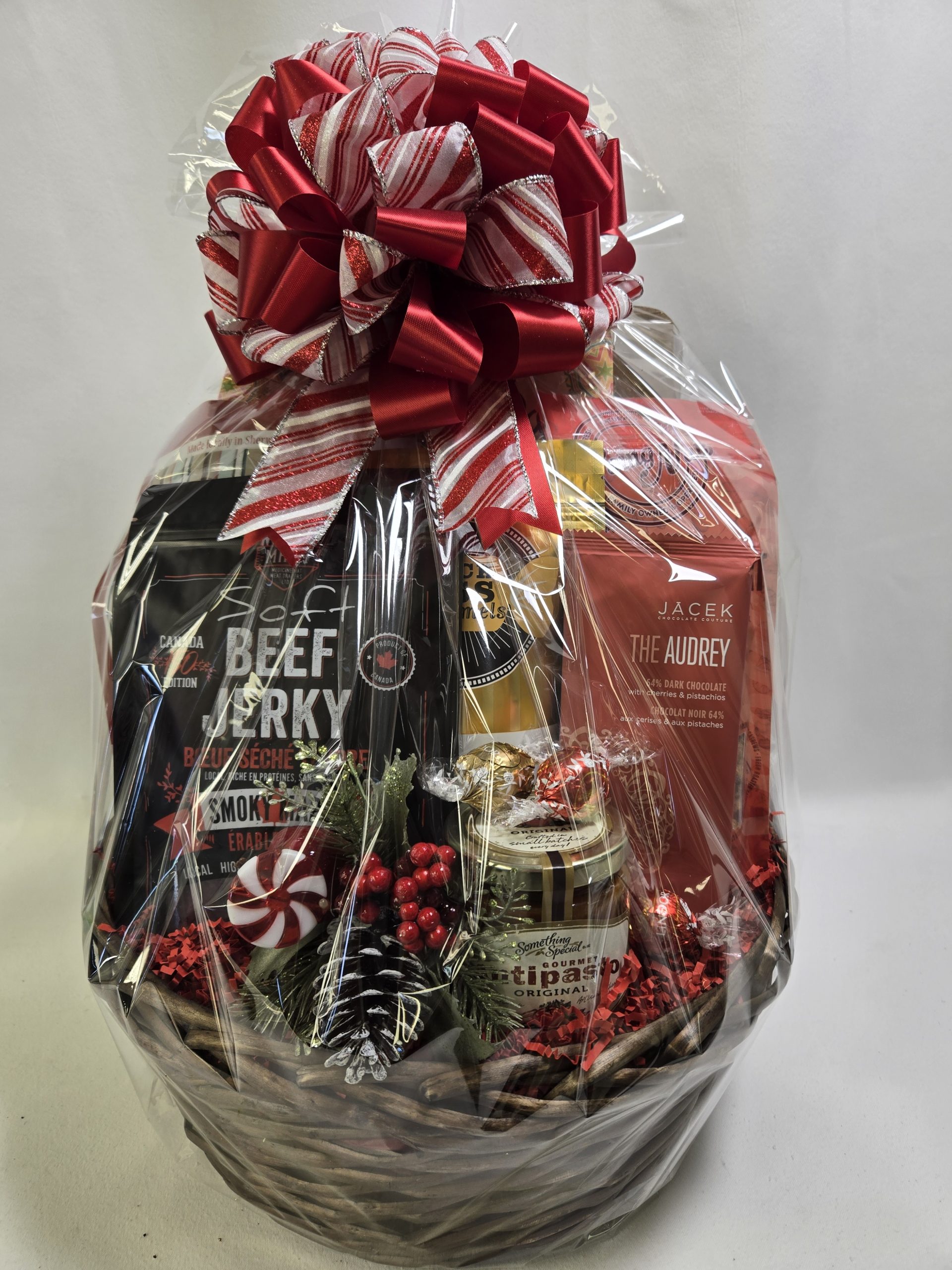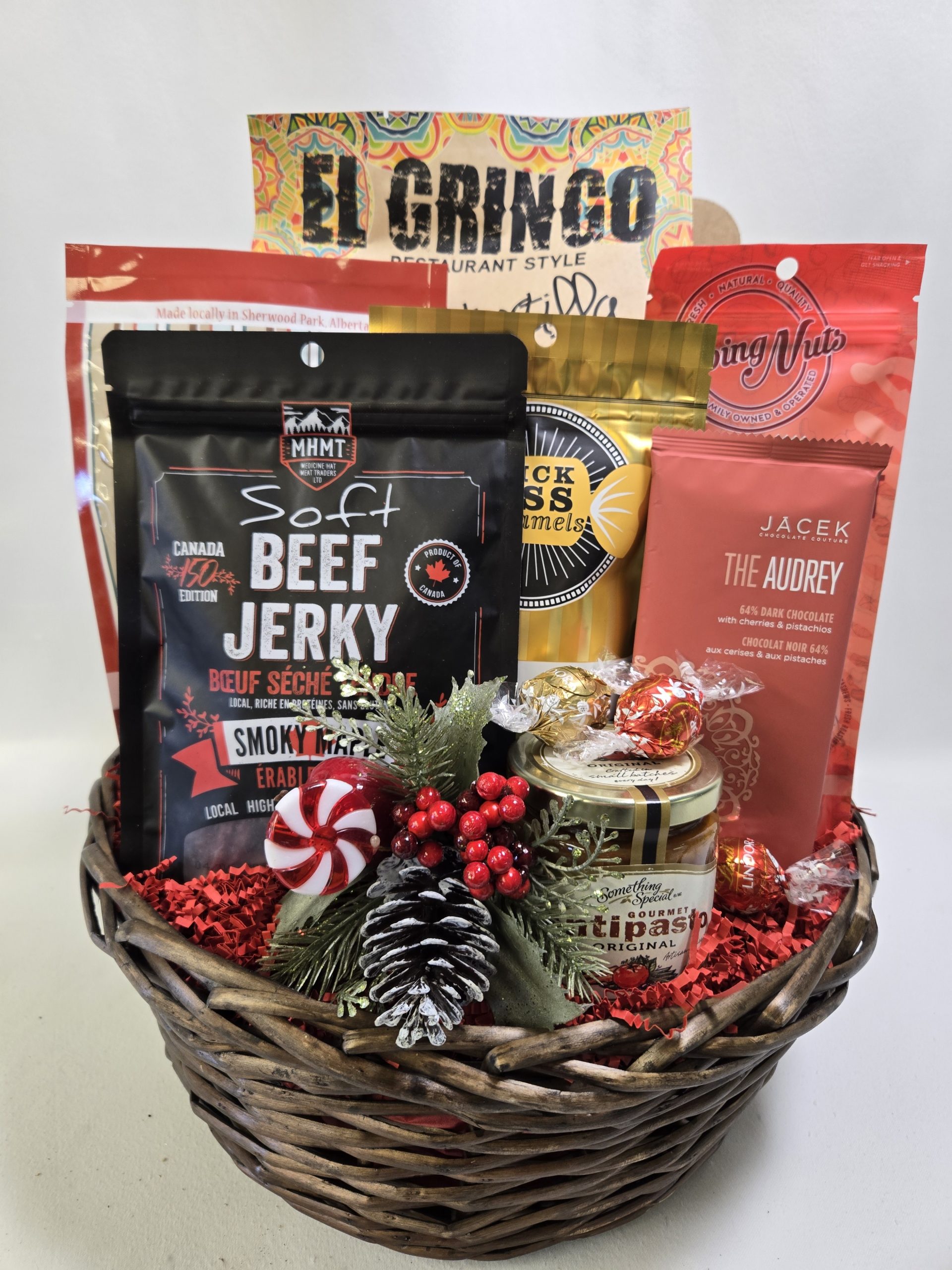 Celebrate local flavor with our Alberta Proud Christmas Gift Basket, featuring an assortment of Alberta-made favorites like soft beef jerky, artisan chocolate, seasoned nuts, gourmet antipasto, and sweet caramels. Beautifully arranged in a rustic wicker basket with festive holiday touches, this locally inspired gift basket is perfect for showcasing Alberta pride while spreading Christmas cheer.