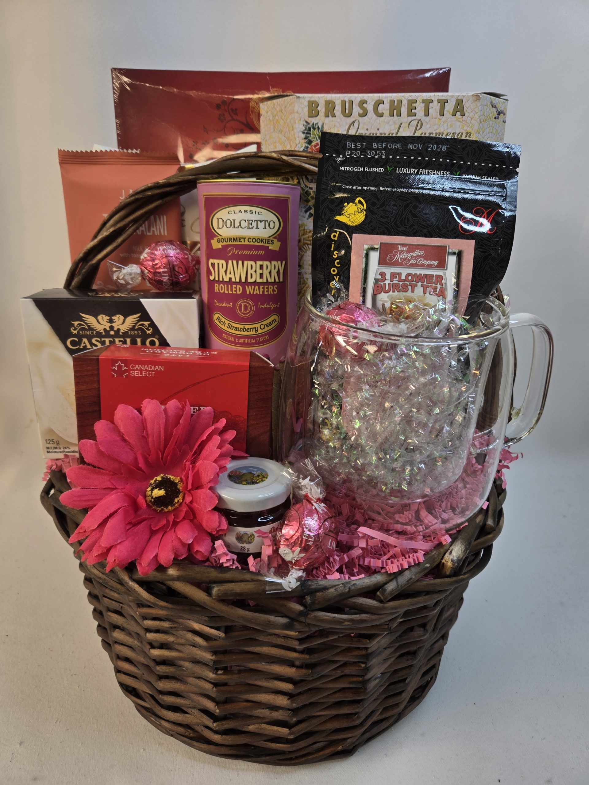 • Presented in a round wicker basket, wrapped in cellophane and complemented with a handmade bow