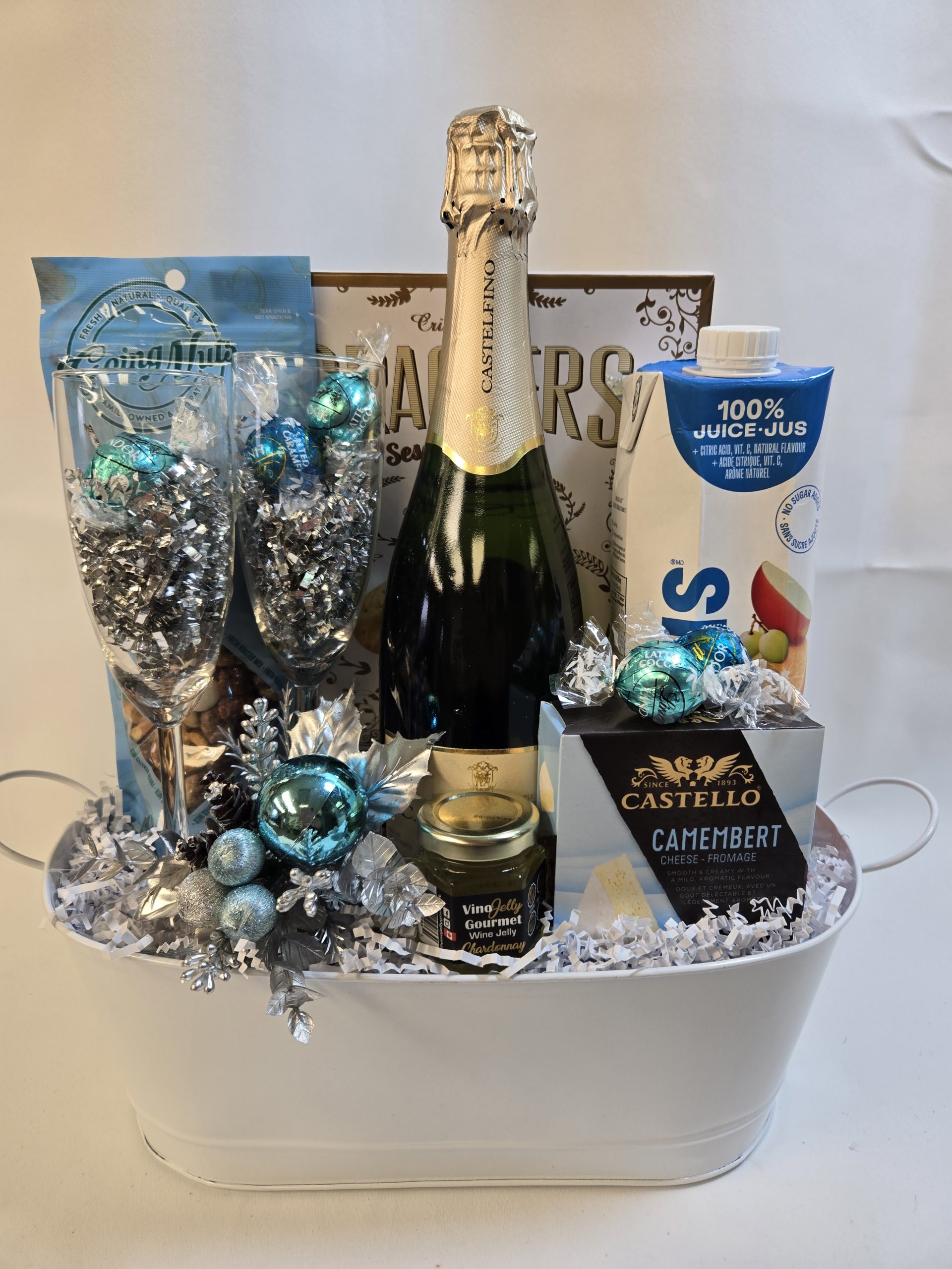 Celebrate Christmas morning in style with this elegant Mimosa Gift Basket featuring sparkling wine, gourmet cheese, crackers, and juice for the perfect holiday toast. Beautifully presented with festive accents, it’s an ideal Christmas gift for brunch lovers, hosts, or anyone who enjoys a little sparkle with their holiday cheer.