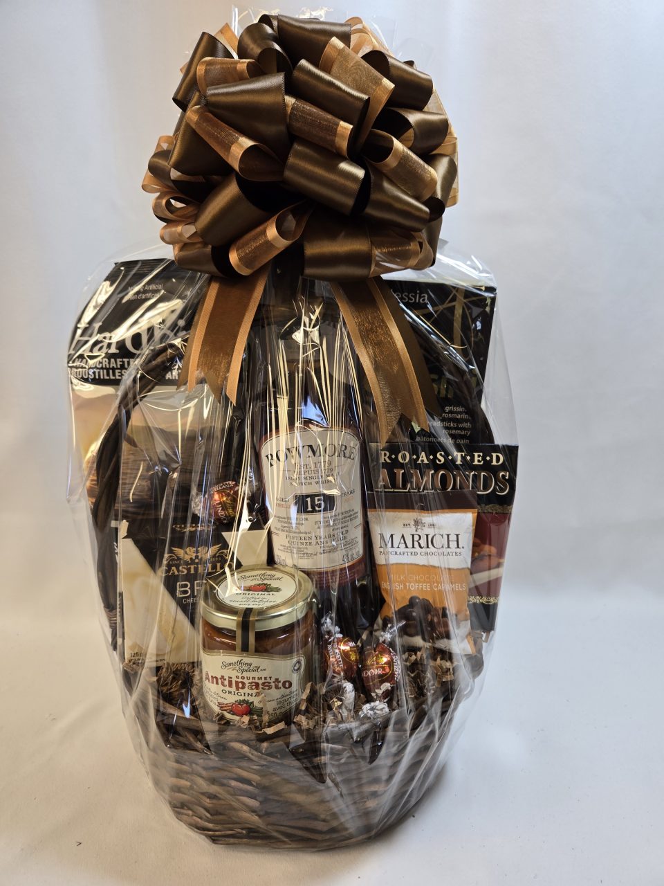 - Presented in a wicker basket, wrapped in cellophane and complimented with a handmade bow