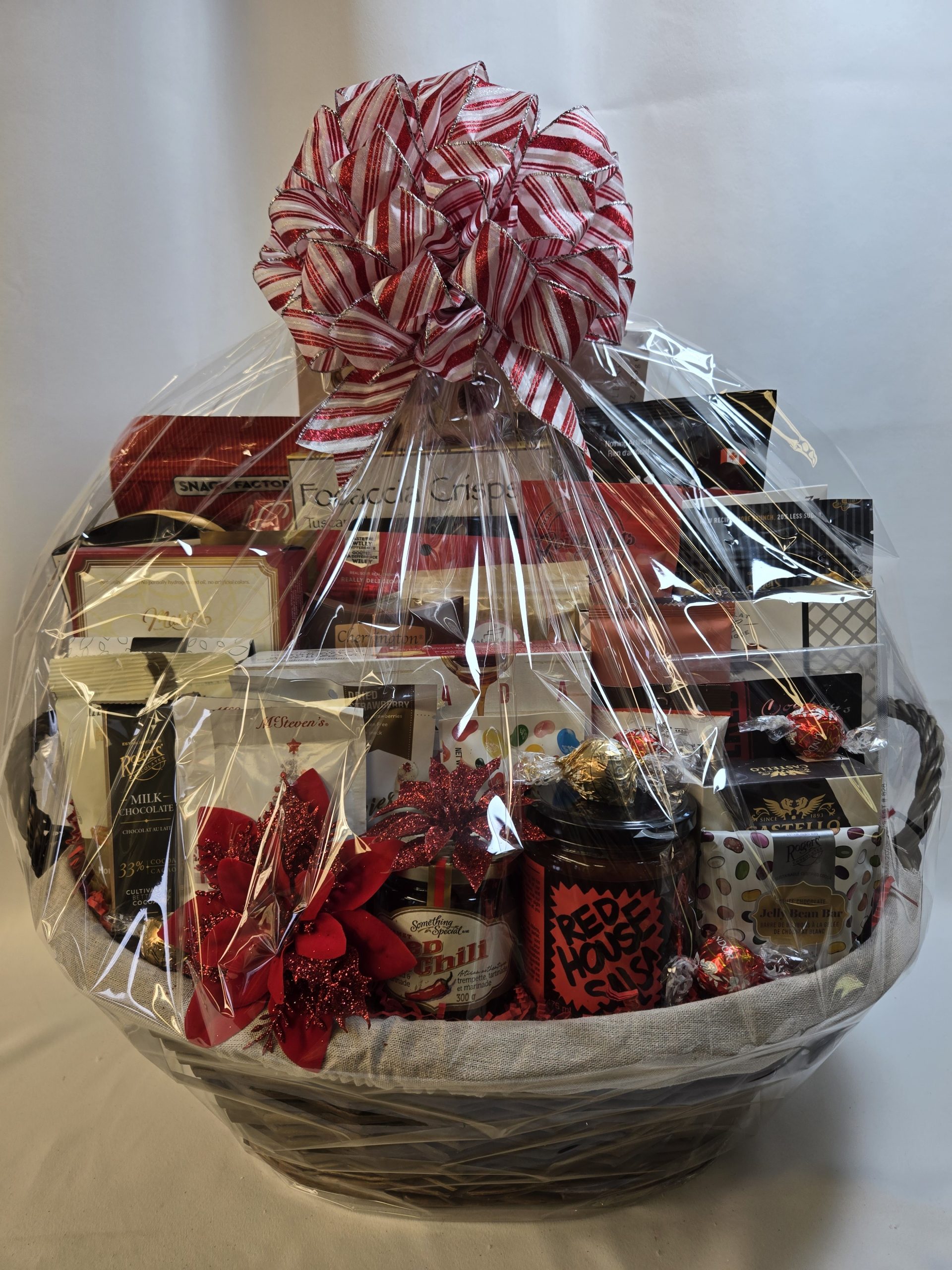 Get ready for festive cheer with our Here Comes Santa Gift Basket, a grand assortment of sweet and savory delights including Red House salsa, Tuscan-style crisps, premium chocolates, truffles, and gourmet snacks. Beautifully decorated with vibrant red poinsettias, this luxurious Christmas gift basket is perfect for sharing holiday joy with family, friends, employees, or clients.