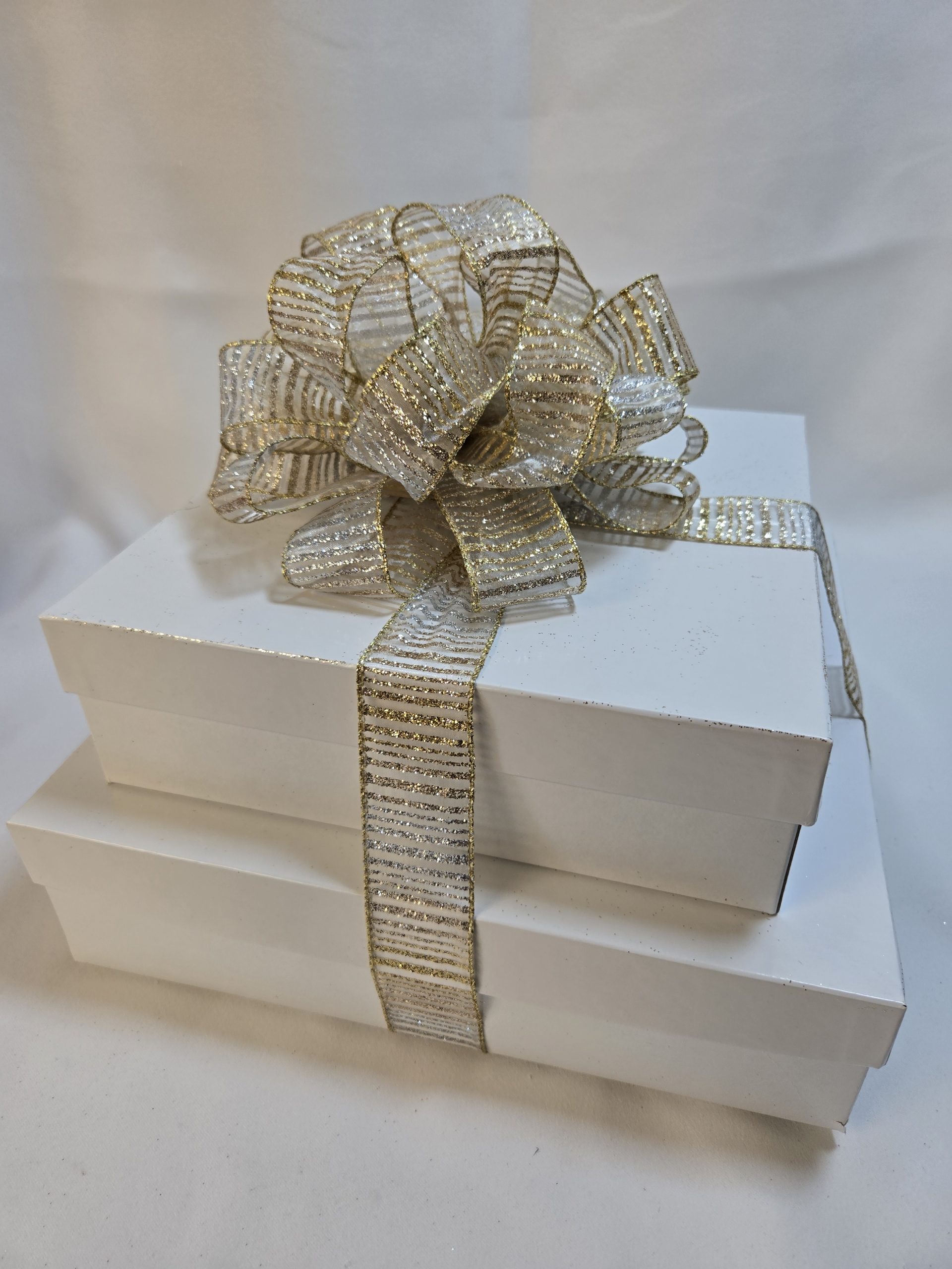 * The boxes are stacked/tiered, then tied with festive ribbon and complimented with a handmade bow.