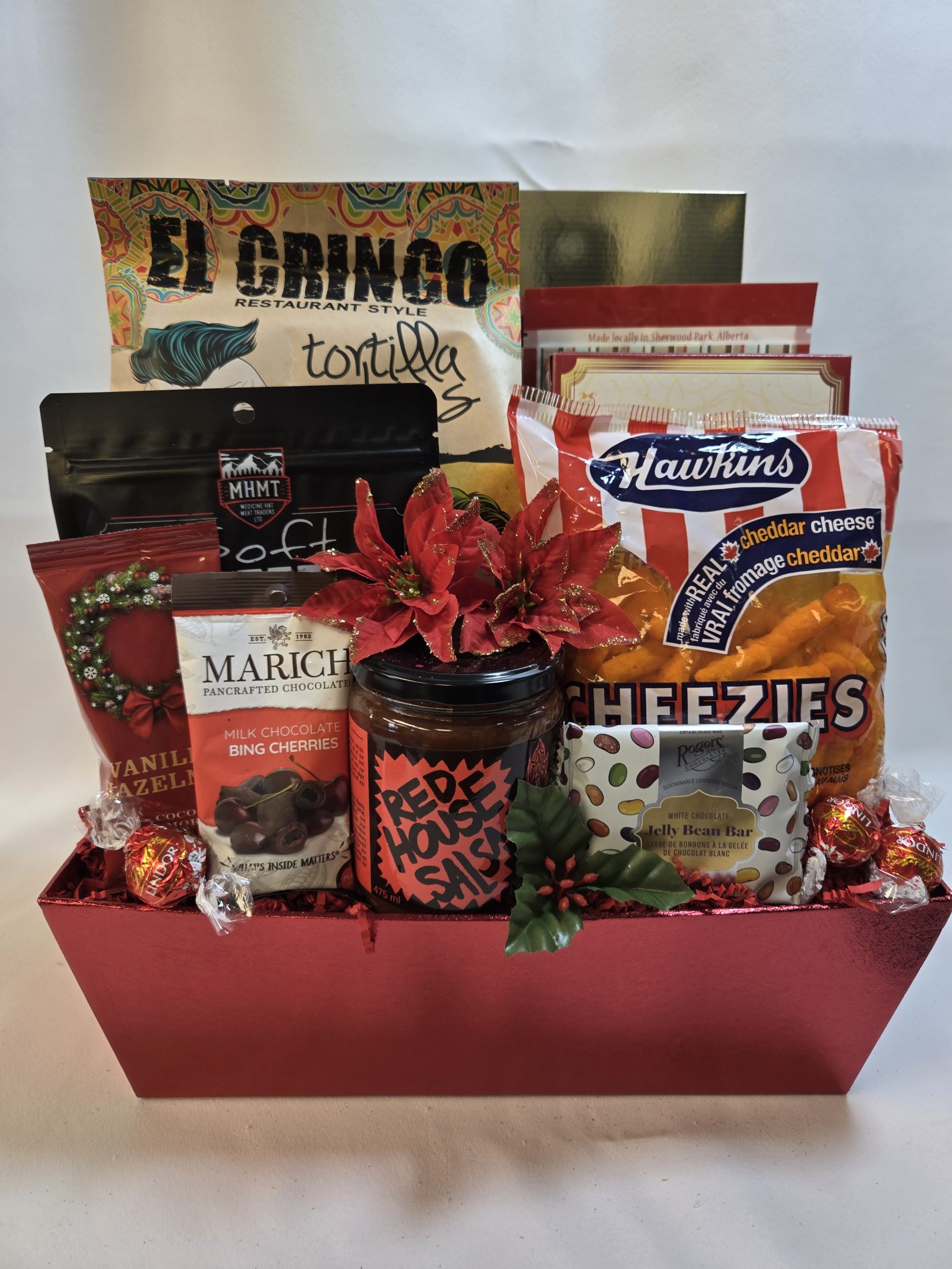Add some crunch to the holidays with our Merry Munchies Gift Basket, packed with Canadian-made favorites like Red House salsa, soft beef jerky, El Gringo tortilla chips, Cheezies, and gourmet chocolates. Perfect for snack lovers, employees, or family gatherings, this festive red holiday basket delivers bold flavors and holiday cheer in every bite.