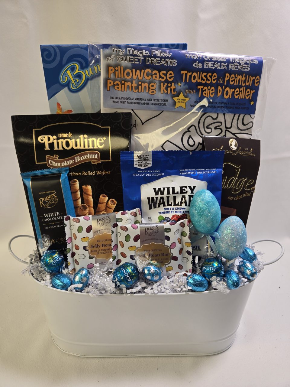 In this Kid-Friendly Gift Basket you will find a Pillowcase Painting kit and yummy treats