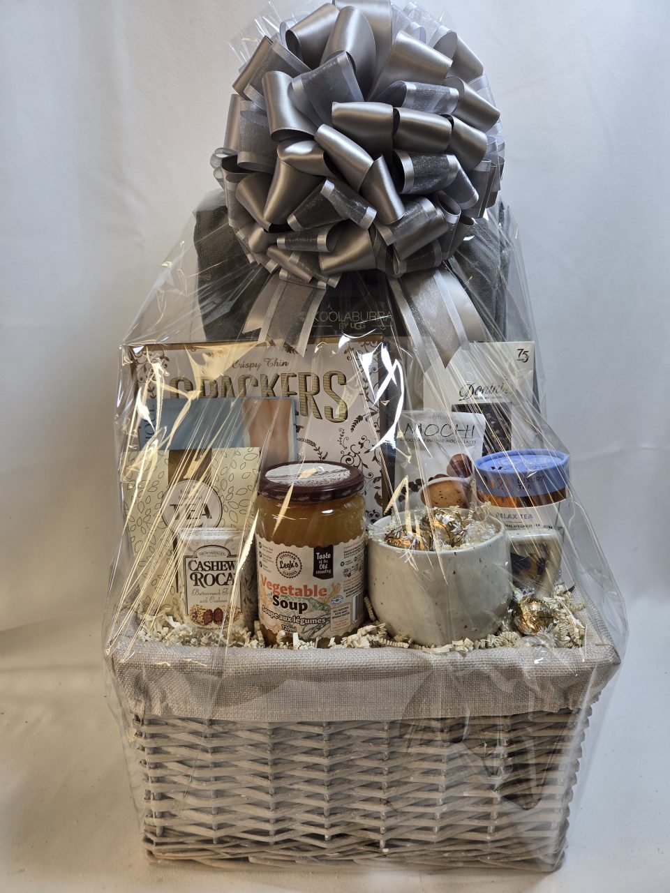 - Presented in a lined wicker basket, wrapped in cellophane and complemented with a handmade bow