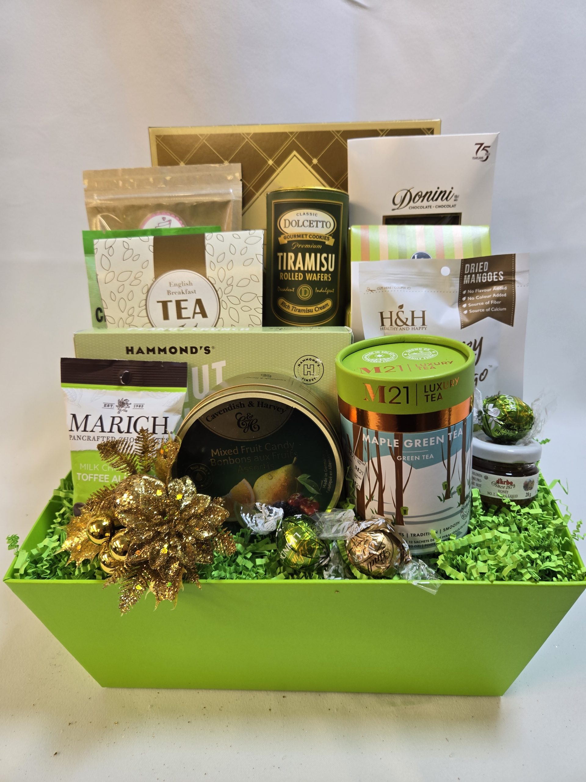 Delight Santa—or anyone on your list—with our Tea & Cookies for Santa gift basket, a festive assortment of premium teas, cookies, biscotti, gourmet chocolates, dried fruit, and sweet treats. Elegantly packaged in a vibrant tray with gold accents, this holiday gift basket is perfect for tea lovers, colleagues, or family gatherings, spreading warmth and joy all season long.